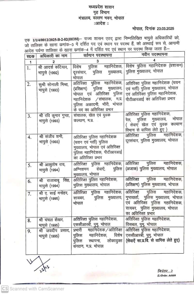1992 बैच के आदर्श कटिहार जो कि वर्तमान में विशेष पुलिस महानिदेशक दूरसंचार पुलिस मुख्यालय भोपाल में थे उन्हें विशेष पुलिस महानिदेशक प्रशासन पुलिस मुख्यालय भोपाल बनाया गया है. इसके अलावा 1993 बैच की सोनाली मिश्रा जो कि अतिरिक्त पुलिस महानिदेशक प्रशिक्षण पुलिस मुख्यालय भोपाल एवं अतिरिक्त पुलिस महानिदेशक संचालक मध्य प्रदेश पुलिस अकादमी भंवरी भोपाल के पद पर अतिरिक्त प्रभार में थीं, उन्हें अतिरिक्त पुलिस महानिदेशक चयन एवं भर्ती पुलिस मुख्यालय भोपाल एवं अतिरिक्त पुलिस महानिदेशक पीटीआरआई का अतिरिक्त प्रभार दिया गया है.