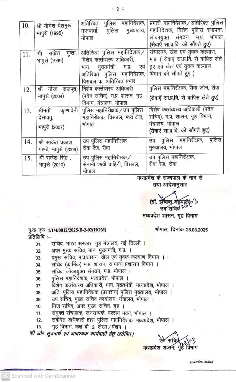 वहीं 1993 बैच के रवि कुमार गुप्ता जोकि संचालक खेल एवं युवा कल्याण में पदस्थ थे उन्हें अतिरिक्त पुलिस महानिदेशक रेल पुलिस मुख्यालय भोपाल बनाया गया है. 1993 बैच के संजीव समिति जो अभी अतिरिक्त पुलिस महानिदेशक चयन एवं भर्ती पुलिस मुख्यालय भोपाल एवं अतिरिक्त पुलिस महानिदेशक पीटीआरआई का अतिरिक्त प्रभात संभाल रहे थे, उन्हें अतिरिक्त पुलिस महानिदेशक दूरसंचार पुलिस मुख्यालय भोपाल में स्थानांतरित किया गया है.