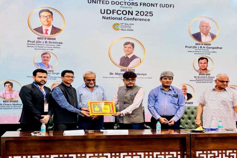 इस अवसर पर यूडीएफ की राष्ट्रीय कोर टीम के प्रमुख सदस्य—डॉ. अरुण कुमार, डॉ. यगिका पारीक, डॉ. भानु कुमार, डॉ. राकेश बेनीवाल, डॉ. अमित व्यास, डॉ. भारत पारीक, डॉ. हृतिक भारद्वाज, डॉ. रिदम, डॉ. शुभ प्रताप सोलंकी, डॉ. मोहम्मद अकील, डॉ. गौरव राज, डॉ. योगेन्द्र पाल यादव, डॉ. हनुमान बिश्नोई, डॉ. हेमेन्द्र शेखावत, डॉ. प्रशांत शर्मा, डॉ. मनीष झा, और डॉ. हर्षित नरानिवाल उपस्थित रहे। यूडीएफकॉन 2025 के दौरान वरिष्ठ पत्रकार मुकेश एस. सिंह को डॉ. ए.पी.जे. अब्दुल कलाम सेवा सम्मान से सम्मानित करते हुए डॉ. लक्ष्य मित्तल, डॉ. बी. श्रीनिवास, डॉ. नीमेश देसाई, डॉ. ओम प्रकाश और डॉ. सुनील खत्री। सम्मान प्राप्ति के बाद समारोह के अन्य अतिथियों के साथ मंच साझा करते मुकेश एस. सिंह; मंच पर मौजूद रहीं देश की चिकित्सा, विधि और मानसिक स्वास्थ्य क्षेत्र की जानी-मानी हस्तियां।