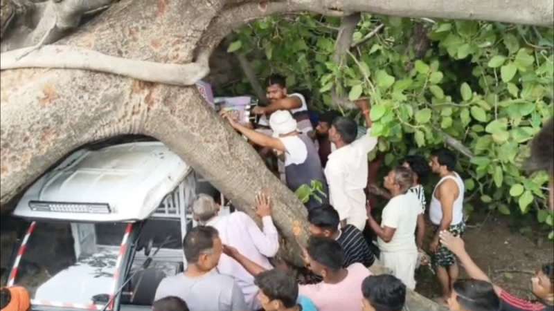 पेड़ के नीचे दबे लोगों को स्थानीय लोगों ने रेस्क्यू कर कड़ी मशक्कत करके बाहर निकाला. मौके पर पुलिस और प्रशासनिक टीम भी पहुंची. टीमों ने पीपल के पेड़ को हटाने का कार्य शुरू किया. बता दें कि बारिश के चलते पीपल के पेड़ के जड़ों की पकड़ गीली मिट्टी से ढीली हुई और आंधी के चलते धाराशाई हो गया. हादसे मे कुछ लोगों को मामूली चोंटे आईं. आइसक्रीम विक्रेता के हाथ पर गंभीर चोट आई है.