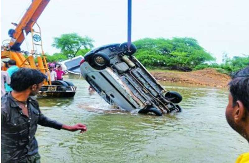 अनूपपुर। अनूपपुर में रविवार की रात तेज बारिश में पुलिया टूटने से बड़ा हादसा हो गया। जिला मुख्यालय से लगभग 11 किलोमीटर दूर राजेंद्र ग्राम स्टेट हाईवे मुख्य मार्ग पर ग्राम पंचायत किरर अंतर्गत सजहा वेयरहाउस के समीप पुलिया टूटने से एक कार नाले के पानी में बह गई। इस घटना में कार में सवार महिला का शव घटनास्थल से कुछ किलोमीटर आगे छीरा पटपर जंगल क्षेत्र से गुजरने वाले नाले में पत्थरों के बीच से बरामद हुआ। वहीं, महिला के पति और उनके दो बच्चे लापता हैं। पुलिस और एनडीआरएफ की टीम उनकी तलाश में जुटी है।