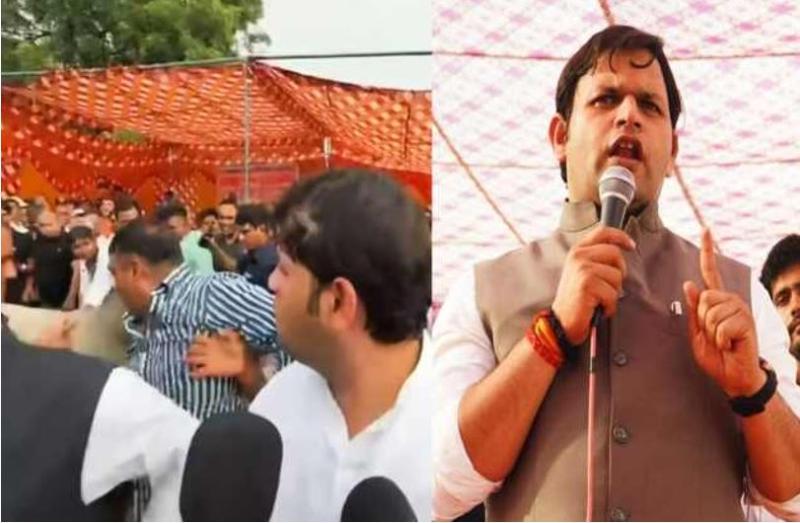 पलवल: हरियाणा के पलवल में खेल राज्य मंत्री गौरव गौतम की सभा में बेसहारा सांड घुसने की वीडियो वायरल हो रही है। घटना 17 सिंतबर को गांव फिरोजपुर की है। जहां ग्रामीणों का धरना समाप्त कराने पहुंचे मंत्री सभा के बाद मीडिया से बातचीत करने के लिए खड़े हुए थे। तभी बेसहारा सांड मंत्री की टोली की तरफ तेजी से आया। लोगों ने 'मंत्री जी-हटिये-हटिये, बचिये-बचिये', चिल्लाना शुरू किया।